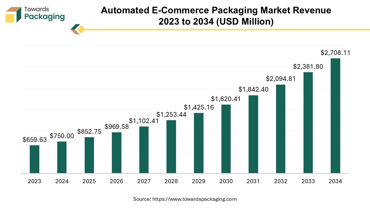 Ottawa, Dec. 17, 2025 (GLOBE NEWSWIRE) -- The global automated e-commerce packaging market reported a value of USD 852.75 million in 2025, and according to estimates, it will reach USD 2708.11 million by 2034, as outlined in a study from Towards Packaging, a sister firm of Precedence Research. The automated e-commerce packaging market is expanding as retailers deploy robotics, AI, and smart systems to boost fulfillment efficiency, reduce costs, and meet sustainability demands while handling rising online order volumes.